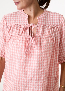 Gingham Nehru Tie Neck Shirred Blouse