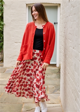 Make a statement with the Painterly Poppies pleated skirt. Featuring a flowing pleated design and an eye-catching poppy print, this skirt moves beautifully with every step. Lightweight and elegant, it’s perfect for dressing up with heels or styling casually with knitwear.